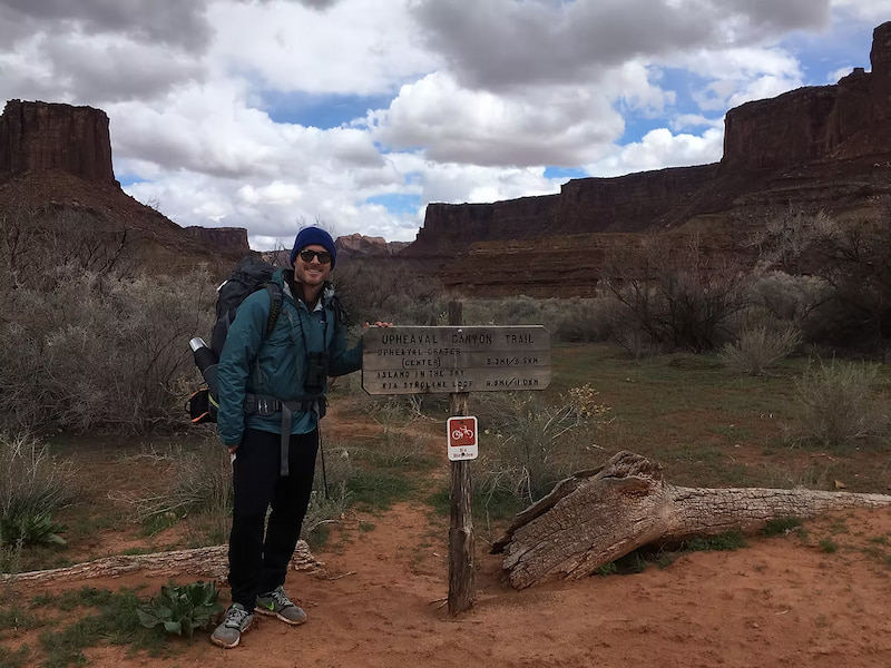 We were on our way to Canyonlands National Park where we would check in at the Visitor’s Center in the Island in the Sky District, purchase an overnight backpacking permit, and head down into the depths of Taylor Canyon. Despite a biting chill in the air and ominous clouds on the horizon, our spirits were high as we set off into the wilderness.