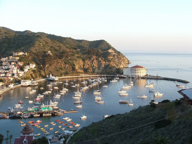 The romantic maritime town of Avalon and the many boats moored in Avalon Bay. The circular building is the Catalina Island Casino. Built in 1929, the Art Deco and Mediterranean Revival building is not actually a casino at all. The main floor is a theatre and the upper floor is a ballroom and promenade