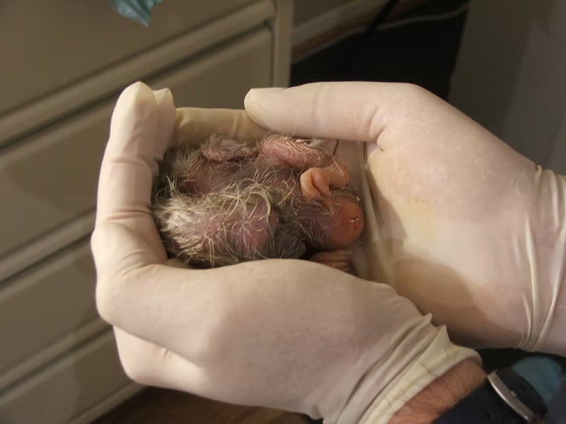 A newly-hatched eaglet in the hands of IWS veterinarian Winston Vickers