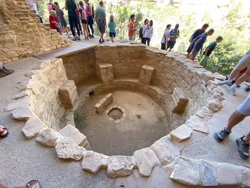 The structures were a mixture of home dwellings and kivas – round depressions in the ground used for spiritual ceremonies. Jordan told us that kivas would have had roofs that were flush with the ground with an escape opening for smoke from the underground fire. He also pointed out a small hole in the ground called a sipapu which resembles the portal through which their ancient ancestors first emerged to enter the present world. Kivas are still widely used by modern-day Puebloan people.