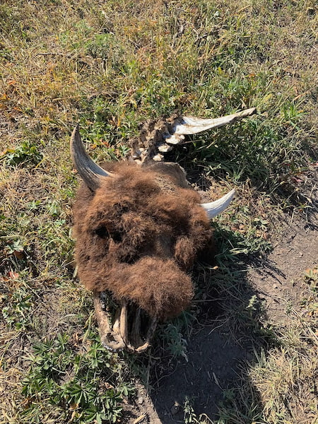 The older males were displaying their size and dominance by bellowing and stomping the ground with their hooves. We also passed several areas bison had used for wallowing and taking dust baths. Bison sign was everywhere. Out in the grasslands of the Lamar valley, we even found a bison carcass with the head still fully intact. Was this the remains of a wolf kill, we thought?